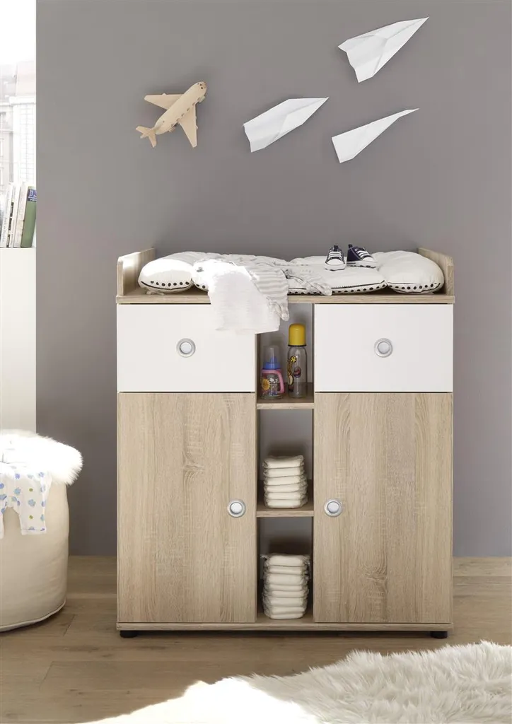 Die Wickelkommode „Floris I“ ist in vornehmer Sonoma-Eiche Nachbildung mit Absetzungen in Weíß gehalten. Mit diesem hellen und freundlichen Design wird sofort jedes Babyzimmer in einen harmonischen und friedvollen Ort verwandelt, an dem die Kleinen friedlich schlummern können. Diese Farbgebung ist ideal für Eltern, die sich überraschen lassen wollen, da diese Farbkombination sowohl für Jungen- als auch für Mädchenzimmer bestens geeignet ist. Die Holznachbildung ist qualitativ sehr hochwertig, mit täuschend echter Maserung.